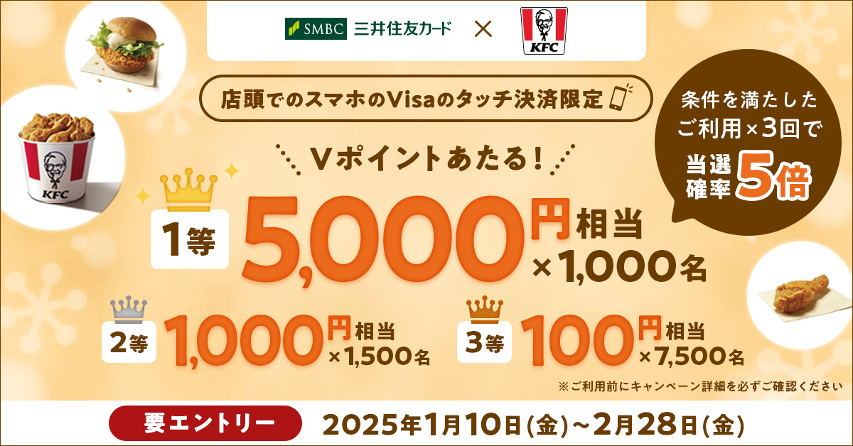 KFCでスマホのVisaのタッチ決済ご利用で10,000名に最大5,000円相当のVポイントプレゼント!|クレジットカードの三井住友VISAカード