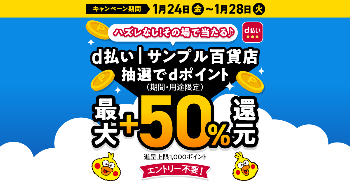 d払い│サンプル百貨店 ハズレなし!抽選で最大+50%還元キャンペーン|キャンペーン期間 2025年1月24日(金)0:00~2025年1月28日(火)23:59