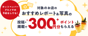 対象のお店のおすすめレポートと写真の投稿・掲載で300ポイントもらえます。