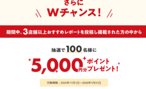 さらに期間中、対象店舗の中から3店舗以上の写真付きおすすめレポートを投稿で、抽選で100名に5000円分ポイントプレゼント!