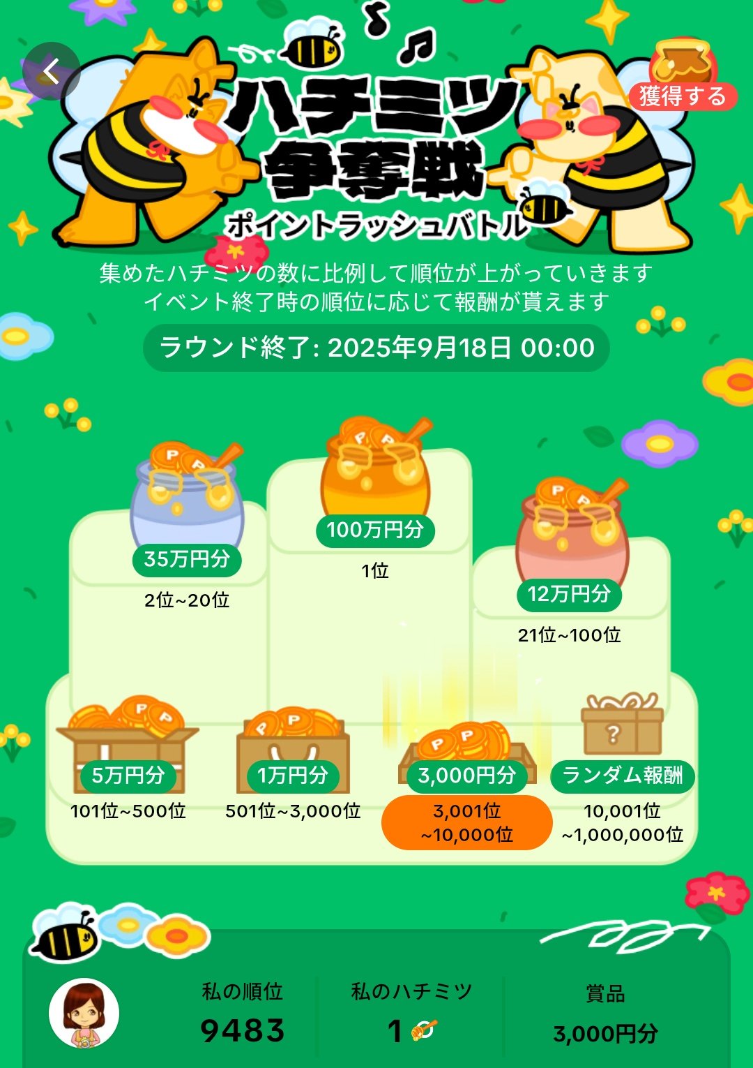 3.ハチミツをあつめる。集めた数に応じてランキングが上がり、賞品を獲得。