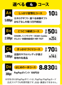 対象商品をスキャンまたはレシート/EC購入明細等を登録して応募ポイントを獲得!ポイントをためて応募すると豪華賞品やPayPay100円分が抽選で合計8,960名様に当たります。