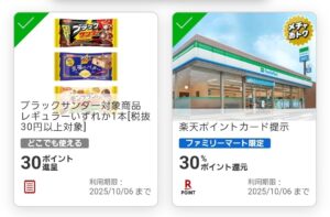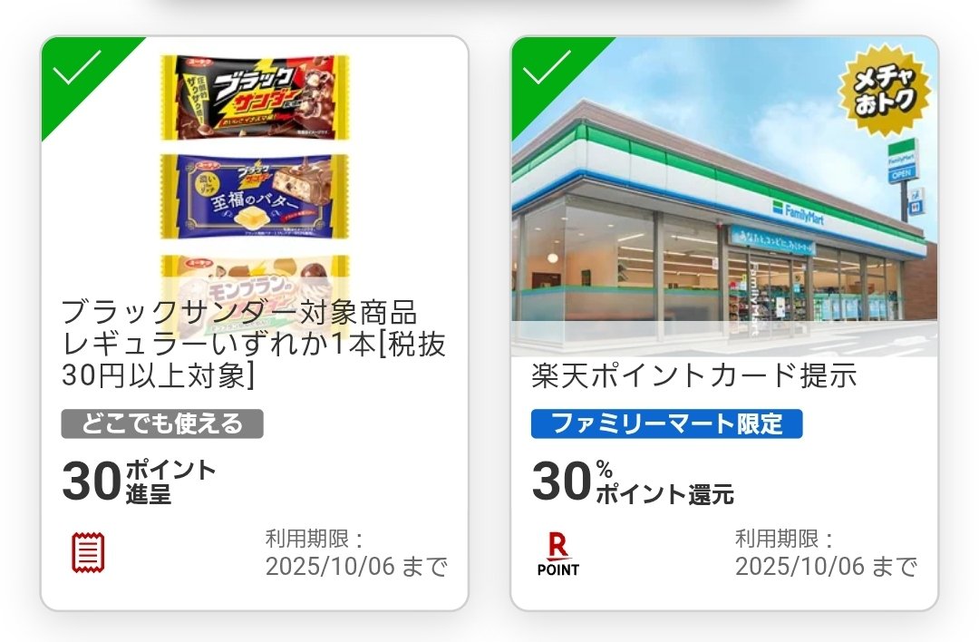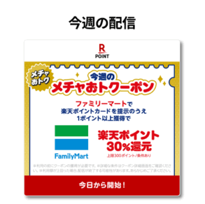 購入前にクーポンゲットでブラックサンダー30ポイント、ファミリーマートで500円以上買い物&楽天ポイントカード提示で30%ポイント還元!