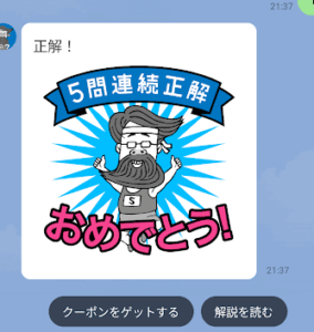 5問連続でクイズに正解すると、セブンイレブンで引換えできるポカリスエットまたはイオンウォーターいずれか1個無料クーポンが必ずもらえます。