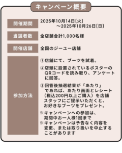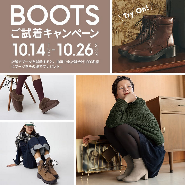 キャンペーン期間中にブーツを試着し、店内のポスターまたはQRコードをスキャンし、アンケートに回答、当たりがでると1000名に好きなブーツがその場でもらえます。