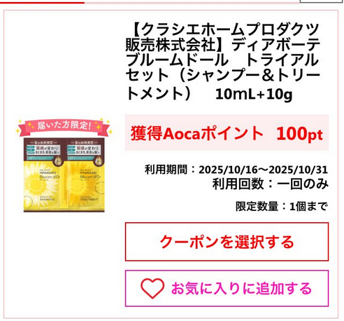 ディアボーテ(シャンプー&トリートメント)税込110円購入で100ポイントもらえます。