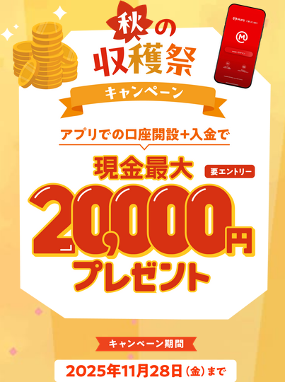 三菱UFJ銀行の新規口座開設\秋の収穫祭/キャンペーンの紹介です。(~11/28まで)お子様の口座開設も対象です!