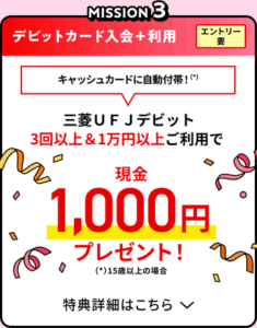 • 三菱UFJデビット3回以上&1万円以上ご利用で現金1,000円プレゼント