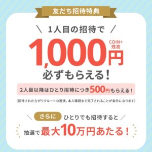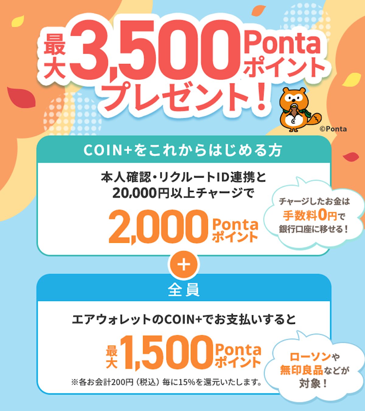 COIN+を新規に始める方は、本人確認+リクルートID連携+2万円以上チャージで2000ポンタポイントGET!