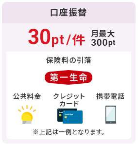 - 口座振替(銀行引落)で30pt/件 最大300pt/月