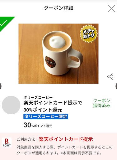 楽天パシャにタリーズコーヒー 30%ポイント還元ででています。