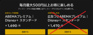 2.ABEMAプレミアム:Disney+ スタンダード、ABEMAプレミアム:Disney+ プレミアムのいずれかのプラン登録