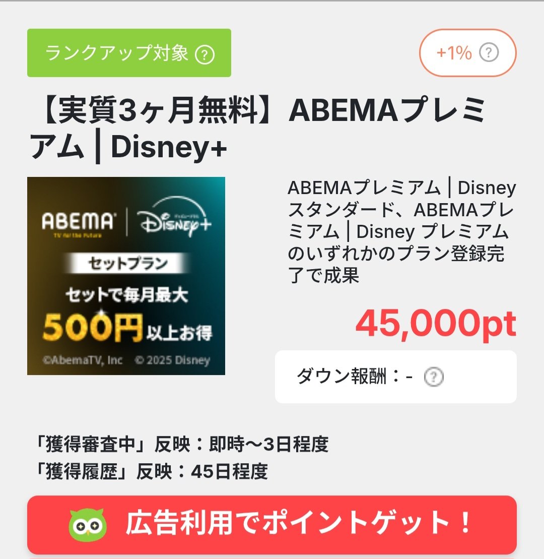 過去にABEMAプレミアムやDisney+登録歴がある場合でも今回の「ABEMAプレミアム | Disney+」の登録が初めてなら成果対象。