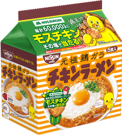 キャンペーン限定パッケージの「チキンラーメン 5食パック」を買ってあたりが出ると モスバーガー「モスチキン無料引換券」が 60,000名にプレゼント