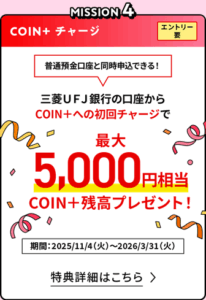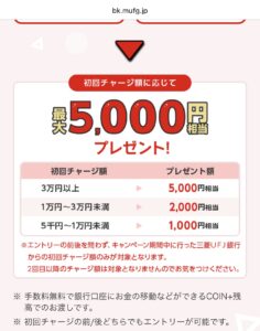 ・三菱UFJ銀行口座からCOIN+(エアウォレット)への初回3万円チャージで5000円相当のCOIN+残高プレゼント