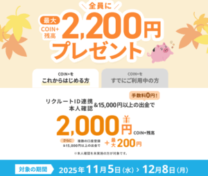 COIN+を新規に始める方は、本人確認+リクルートID連携+15000円万円以上チャージで2000円相当GET!