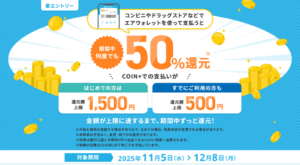 エントリーし、対象店舗(ローソン、無印良品など)でエアウォレットアプリのCOIN+で支払いするだけで、決済金額の50%を還元。