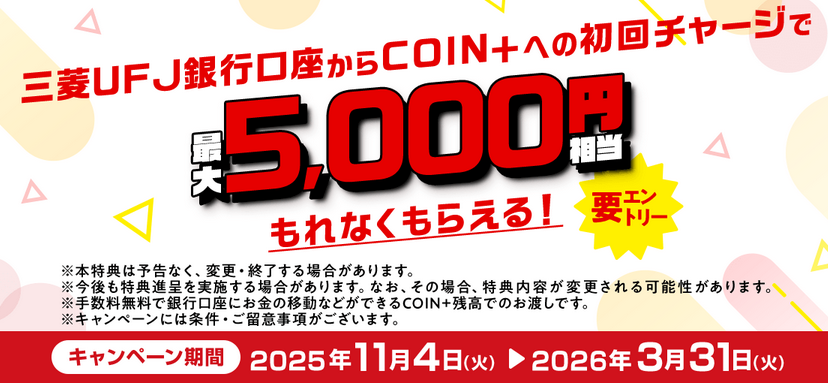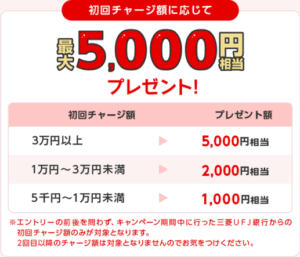 三菱UFJ銀行口座からの初回チャージ額に応じて、最大5,000円相当のCOIN+残高がもれなくプレゼント!