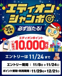 エディオンアプリでポイントが必ず当たるエディオンジャンボのエントリーが始まりました。