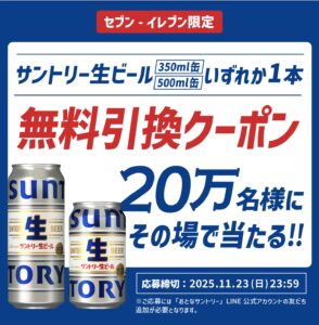 セブンイレブン引き換え限定でサントリー生ビール350ml または500mlが20万名様にその場で当たります。