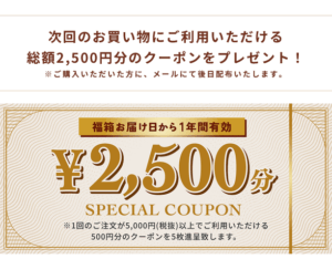 さらに次回のお買い物(5000円(税抜)以上)でつかえる2,500円分のクーポン付き
