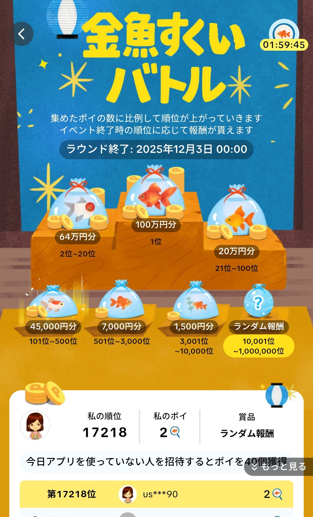3.金魚をあつめる。集めた数に応じてランキングが上がり、賞品を獲得。