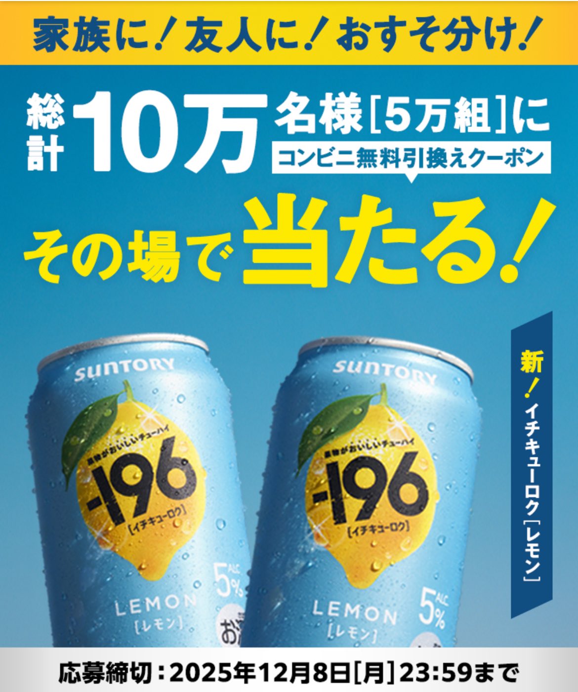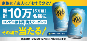 コンビニ無料引き換えクーポンが 抽選で10万名様(5万組)に当たります。