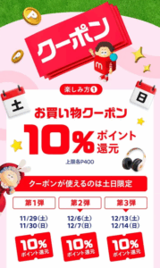 お買い物10%還元クーポンエントリーで全員もらえる。毎週土日