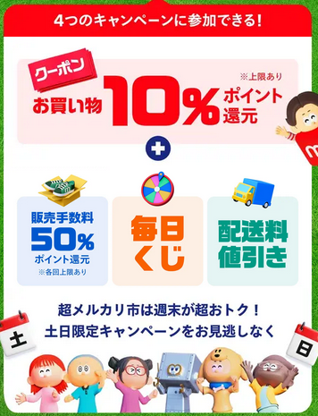 【超メルカリ市~12/16】販売手数料50%還元、大型配送料750円、毎日くじでポイント当たる