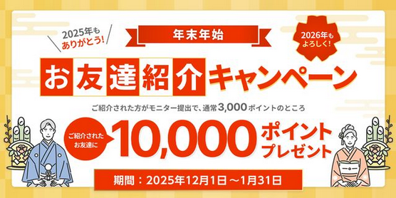 モニターに当選し、調査後に提出物を提出すると、通常3000ポイントのことろ、12月中は、10000ポイント(1000円相当)ゲット!!