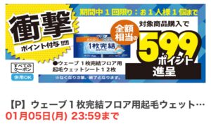 キリン堂アプリで「ウェーブ1枚完結フロア用起毛ウェットシート」をクーポンを提示して買うと599ポイントもらえます。