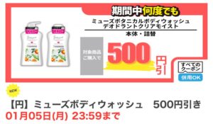 ミューズボディウォッシュをクーポン提示で500円引きに。