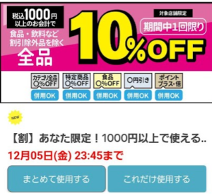 アプリに10%オフクーポンがきている人はこちらも併用できます。12/5まで