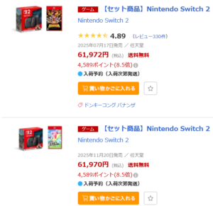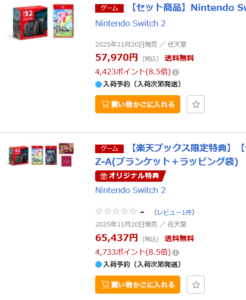 楽天ブックス「Nintendo Switch 2」ゲームソフトとセット販売で買える!ポイントアップ中 「PR」 お得な買物情報 X Facebook LINE コピー 2025.12.04 楽天ブックスから「Nintendo Switch 2」 ゲームとセットで限定販売しています。 今なら楽天スーパーセール期間中でポイント還元も大きいです! クリスマスプレゼントにいかがでしょうか。 Nintendo Switch 2 セット一覧はこちら