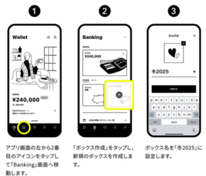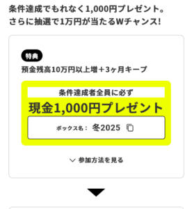 「冬2025」設定したボックスを新規作成し、預金を10万円以上増やして3か月キープするだけで、現金1,000円をもれなくプレゼント!