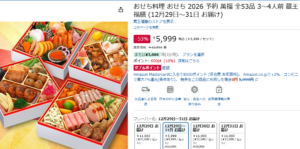 Amazonおせち料理が53%OFF!3~4人前が実質5199円 「PR」 Amazon X Facebook LINE コピー 2025.12.14 Amazonでおせち料理が53%OFFの5,999円 さらに600ポイント還元! おせち料理 おせち 2026 予約 萬福 全53品 3~4人前 蔵王福膳 (12月29日~31日 お届け) https://amzn.to/4rWboOD