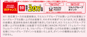購入時にWAON POINTが貯まるカード(またはウエルシアグループアプリの会員コード)を提示で抽選で20万名に50ポイント当たる!