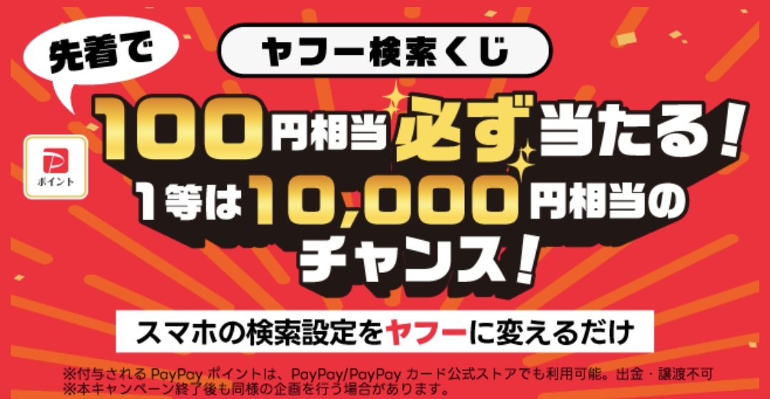 ヤフー検索くじで100円相当PayPayポイント必ずもらえます。スマホの検索設定を「Yahoo!」に変えるだけ!