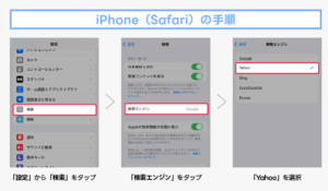 iPhone:設定→検索をタップ→検索エンジン→Yahooを選択