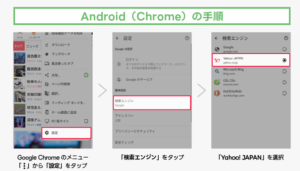 Android(Chrome):「︙」から設定をタップ→検索エンジン→Yahooを選択