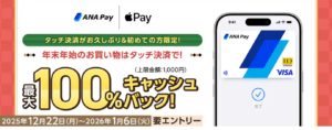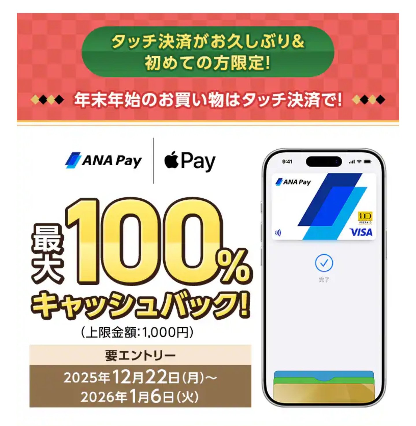 【ANA公式サイト】ANA Pay 年末年始のお買い物はANA Payのタッチ決済をApple Payで!最大100%キャッシュバックキャンペーン!