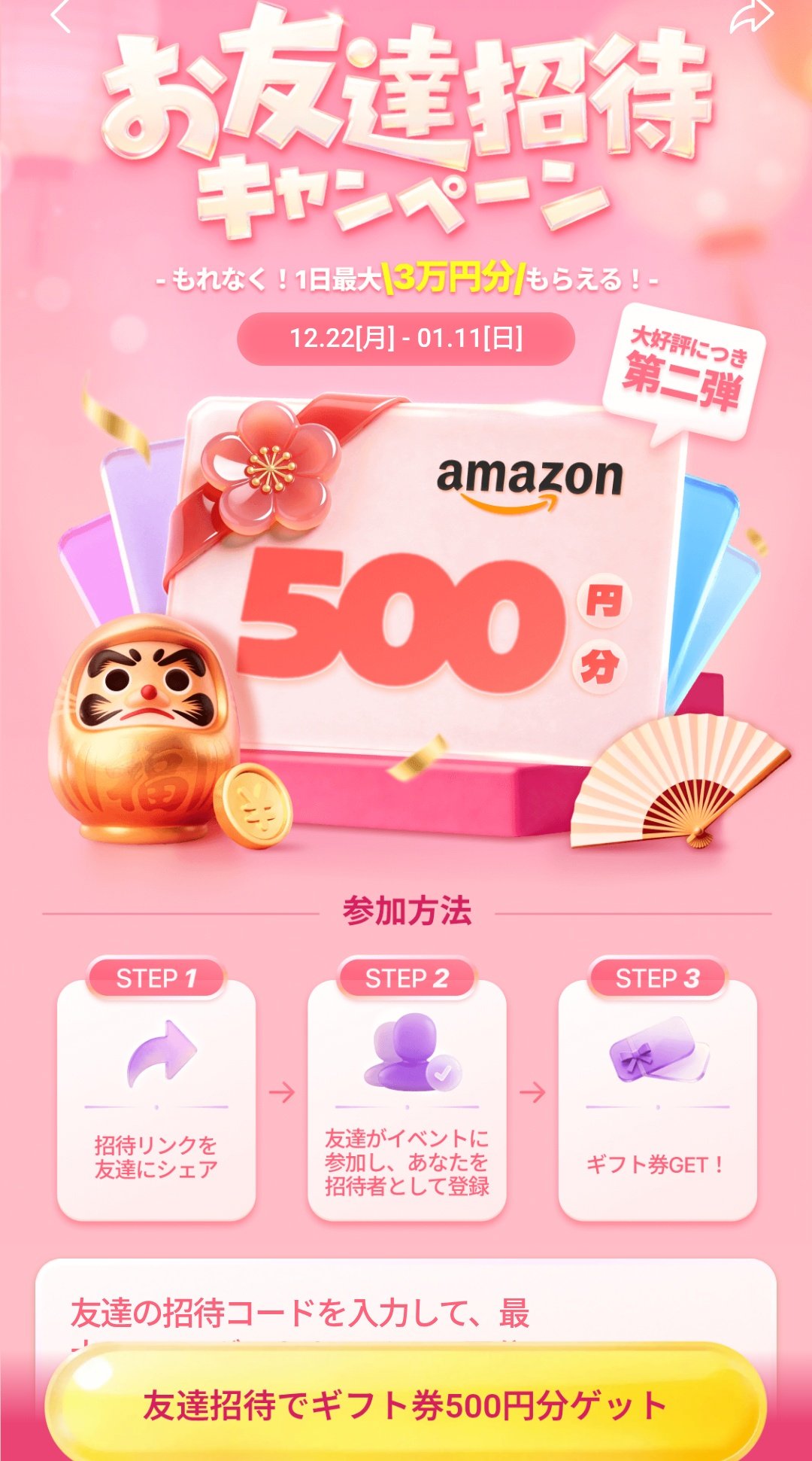 紹介リンクから登録→タスク達成で Amazonギフト券最大1000円もらえる