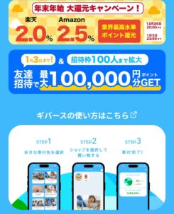 2.ギバース経由でAmazon・楽天・Qoo10いずれか税抜2000円以上お買い物。アマギフ購入でもOK