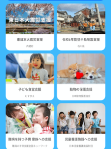 寄付先は、子ども支援、動物保護、災害復興支援(例:能登半島地震支援)、国際協力など自分が支援したい社会貢献団体を自由に選ぶことができます。