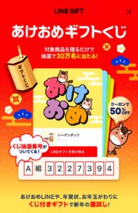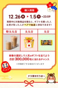 1/5までにくじ対象商品を贈るとお互いにコンビニギフトが抽選で30万人に当たります。