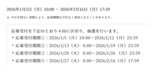 4回に分けて抽選。期間中1回のみ応募可能。