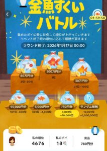 3.金魚をあつめる。集めた数に応じてランキングが上がり、賞品を獲得。