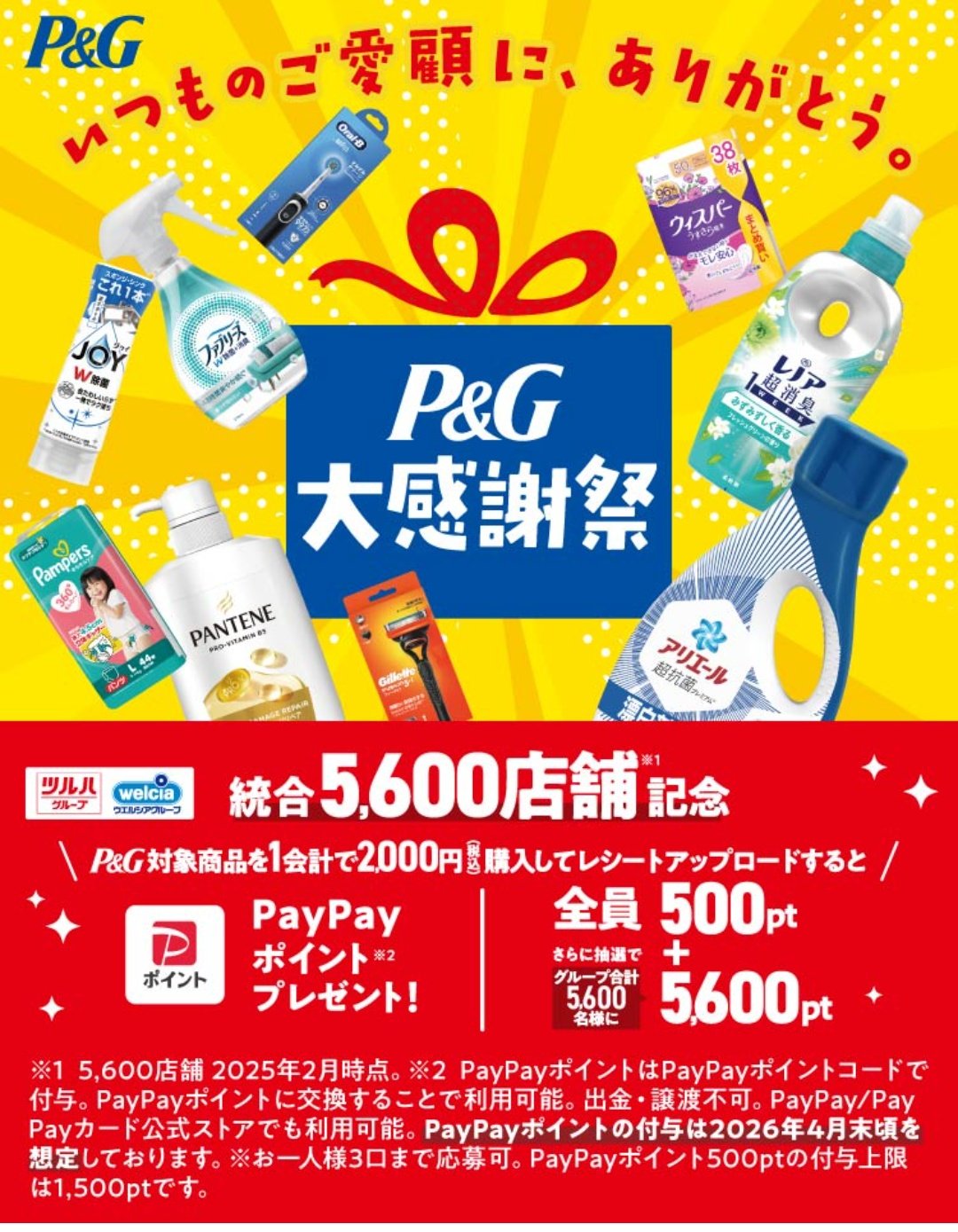P&G対象商品を1会計で2,000円(税込)以上購入したレシート/購入明細を、応募期間内にキャンペーンサイト上にアップロードすると、PayPayポイント500pt(最大1,500pt)が全員もれなくもらえます。