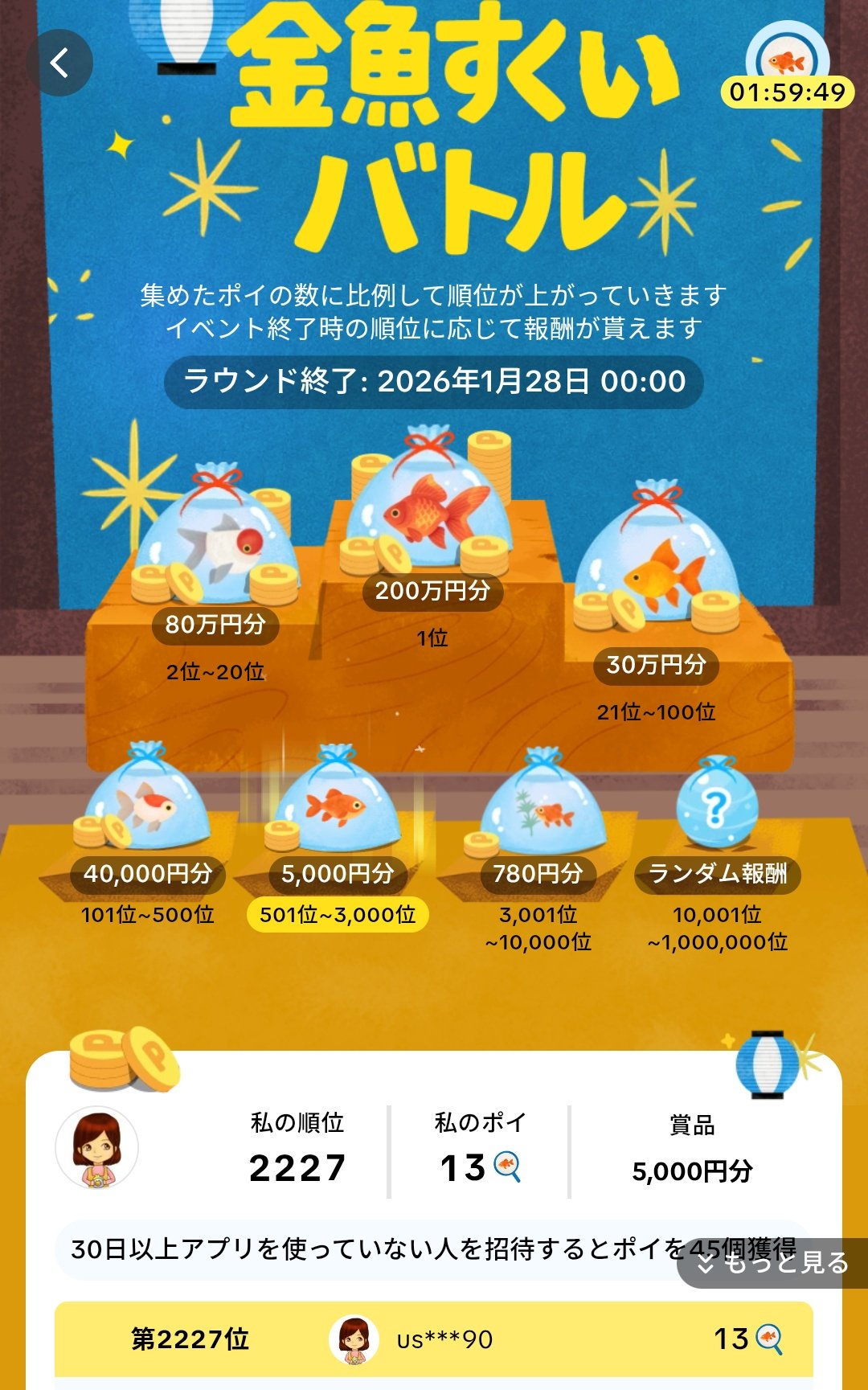 3.金魚をあつめる。集めた数に応じてランキングが上がり、賞品を獲得。