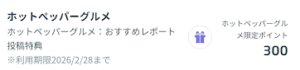 おすすめレポート対象店舗の場合、レビューと写真投稿で300ポイントもらえます。